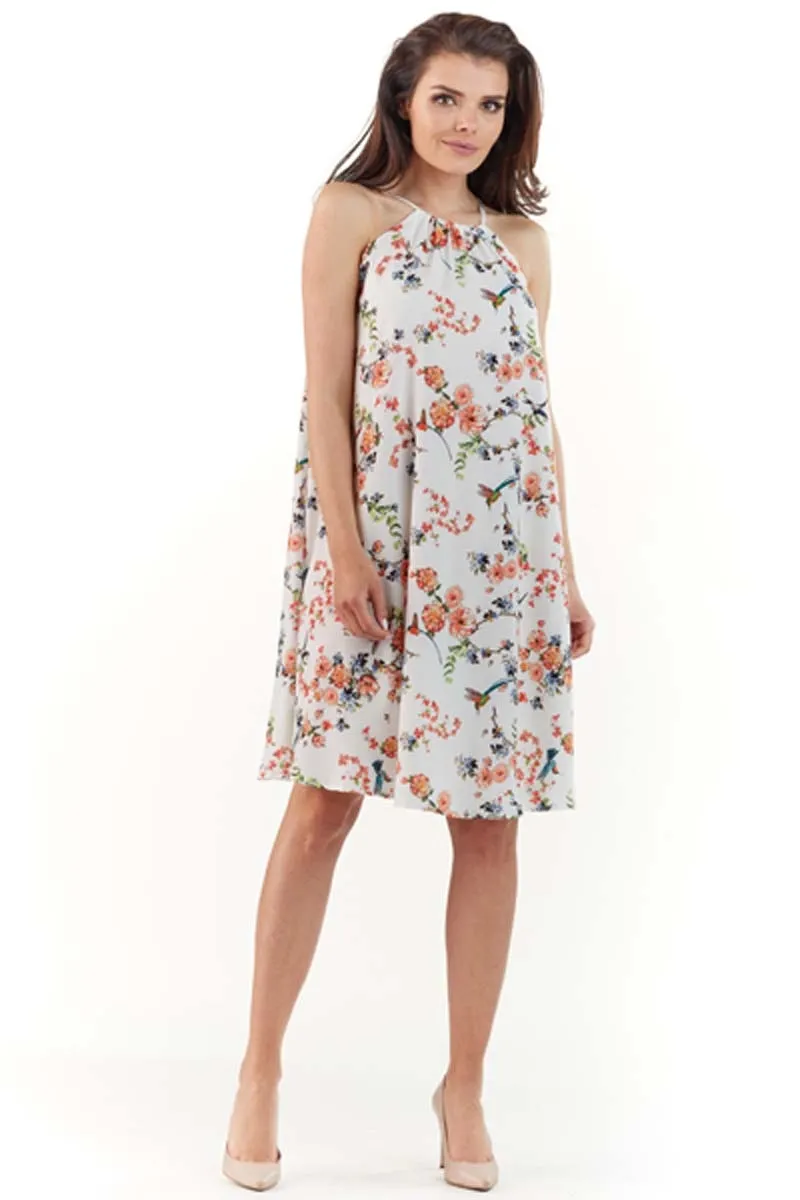 Ecru Zwiewna Sukienka Mini w Kwiatowy Wzór z Wiązanym Dekoltem