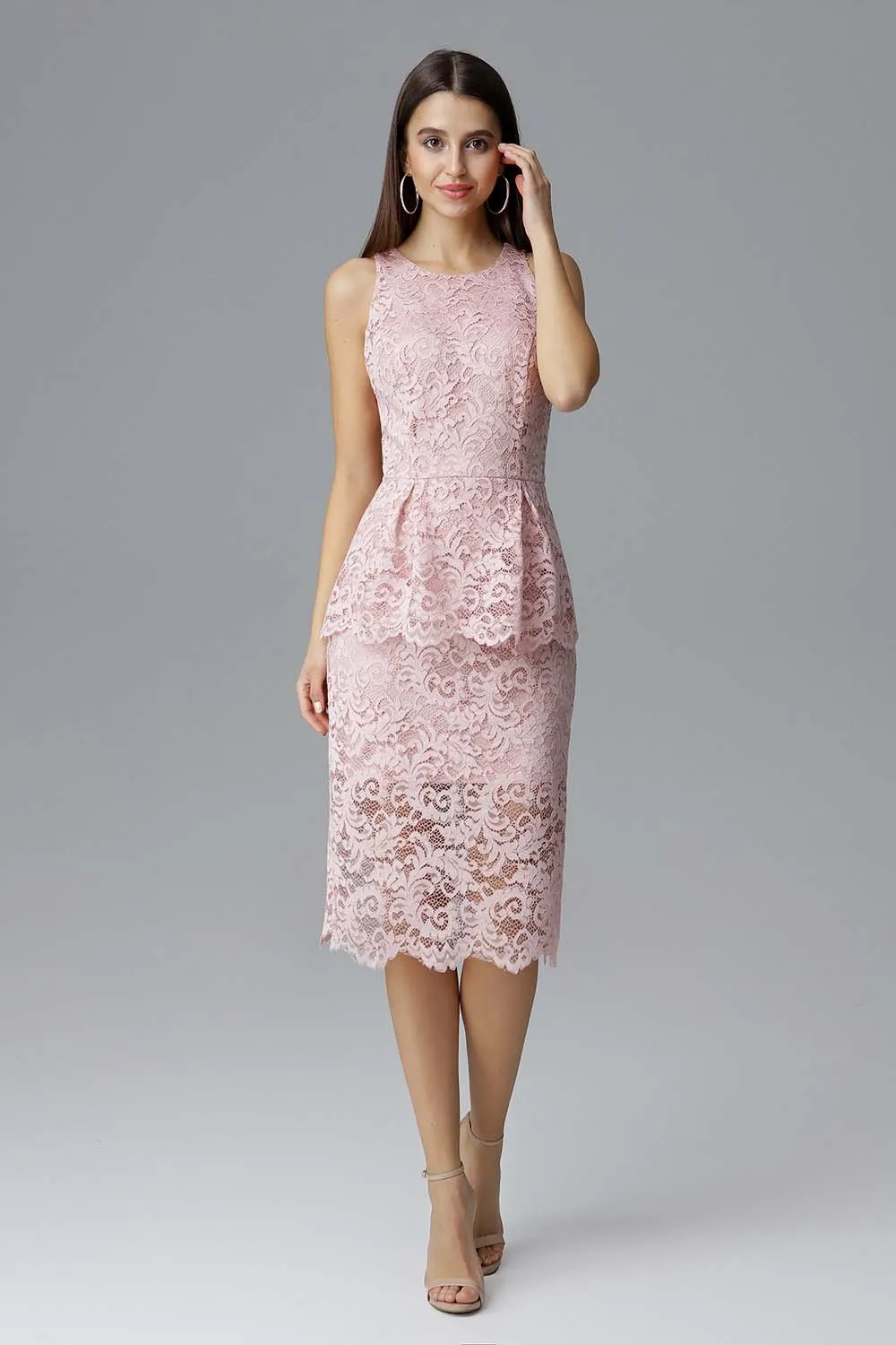 Różowa Koronkowa Dopasowana Sukienka z Baskinką