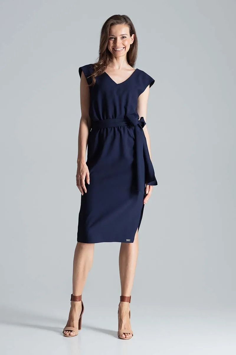 Szara Prosta Midi Sukienka z Dekoltem V z Paskiem