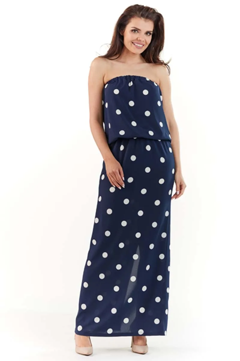 Maxi Granatowa Sukienka w Białe Grochy z Odkrytymi Ramionami
