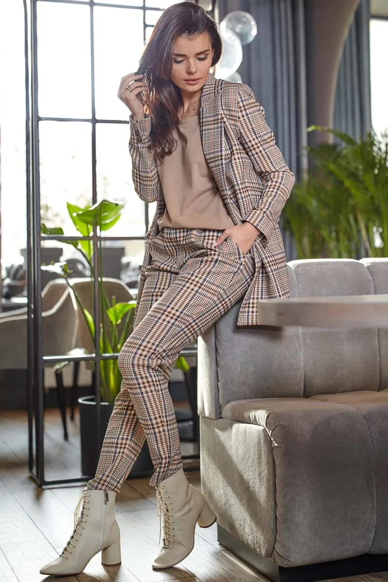 Spodnie w Kratę ze Zwężanymi Nogawkami - Brązowe