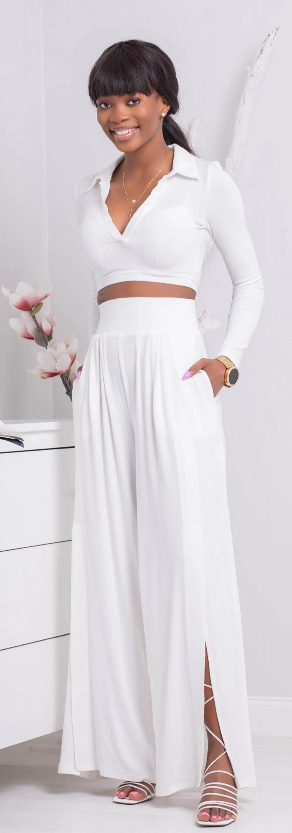 Szerokie spodnie z cienkiego prążka Białe DONAT 127