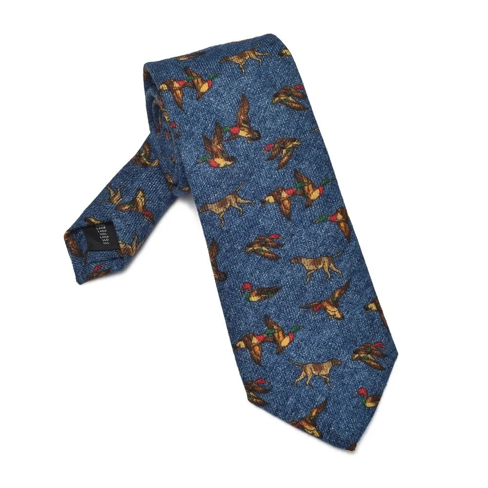 Niebieski wełniany krawat Ascot w psy i ptaki