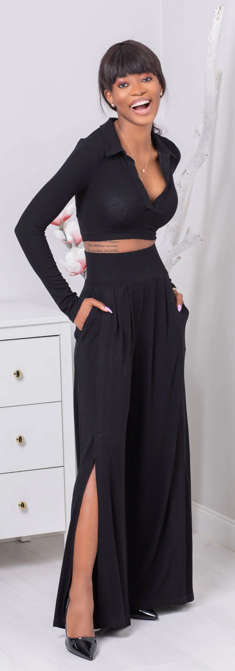Szerokie spodnie z cienkiego prążka Czarne DONAT 127