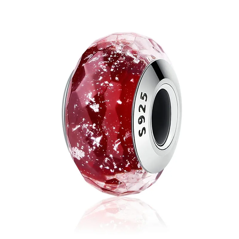 Szklany czerwony charms ze srebrnymi drobinkami koralik beads srebro 925