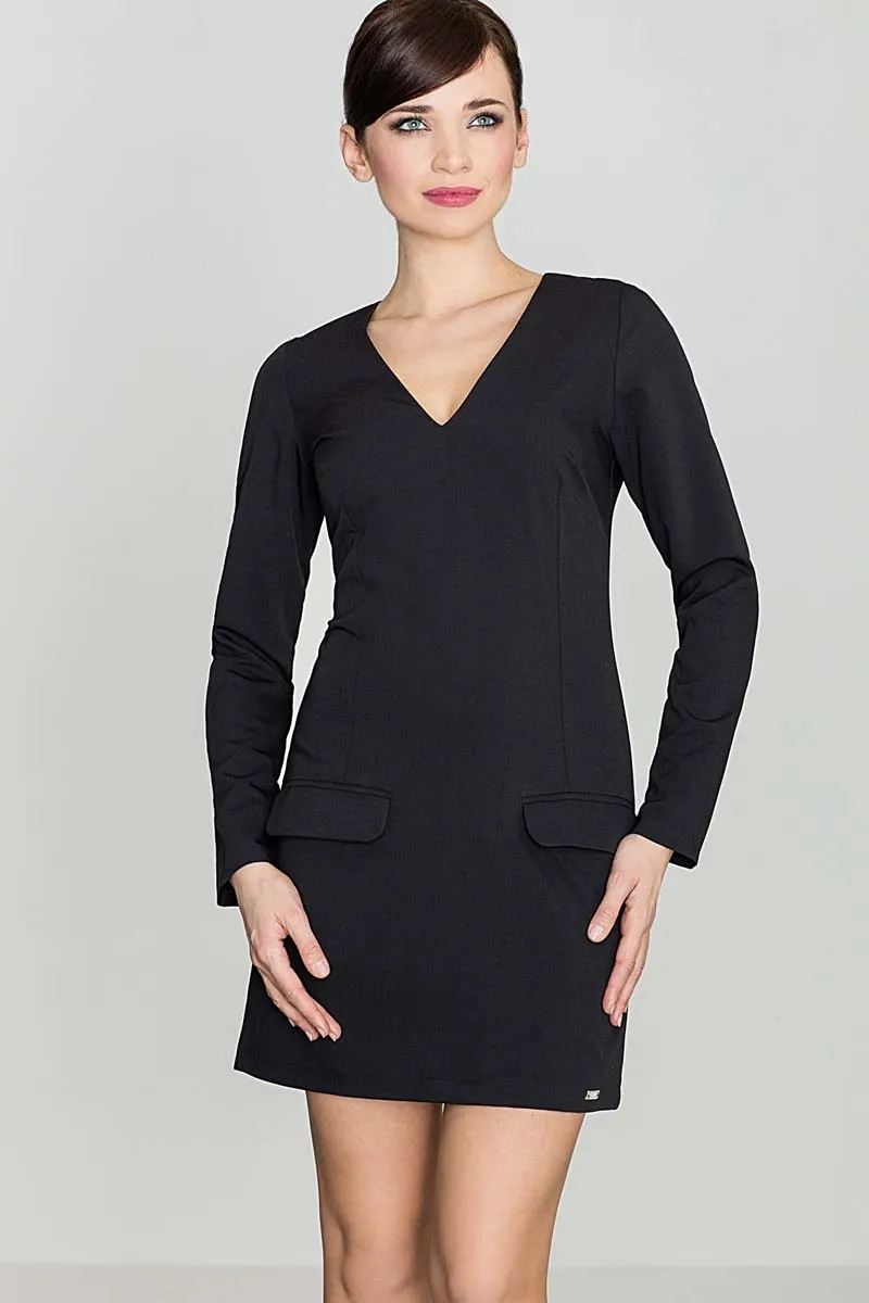 Prosta Czarna Sukienka z Ozdobnymi Patkami z Długim Rękawem