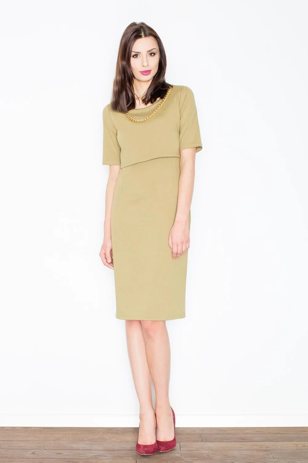 Oliwkowa Elegancka Midi Sukienka z Biżuteryjnym Łańcuszkiem