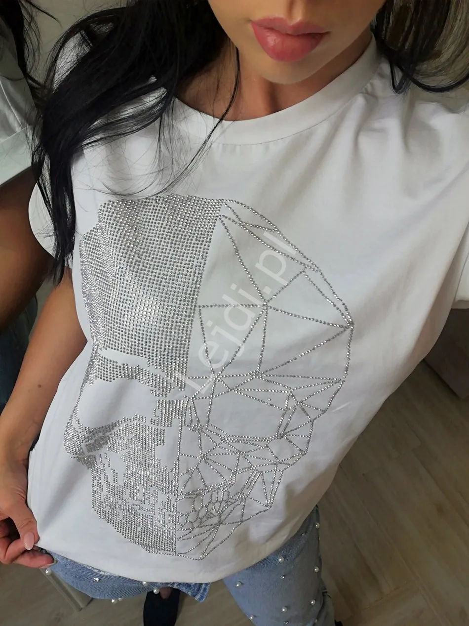 Biała koszulka z czaszką z kryształków, bawełniana koszulka skull