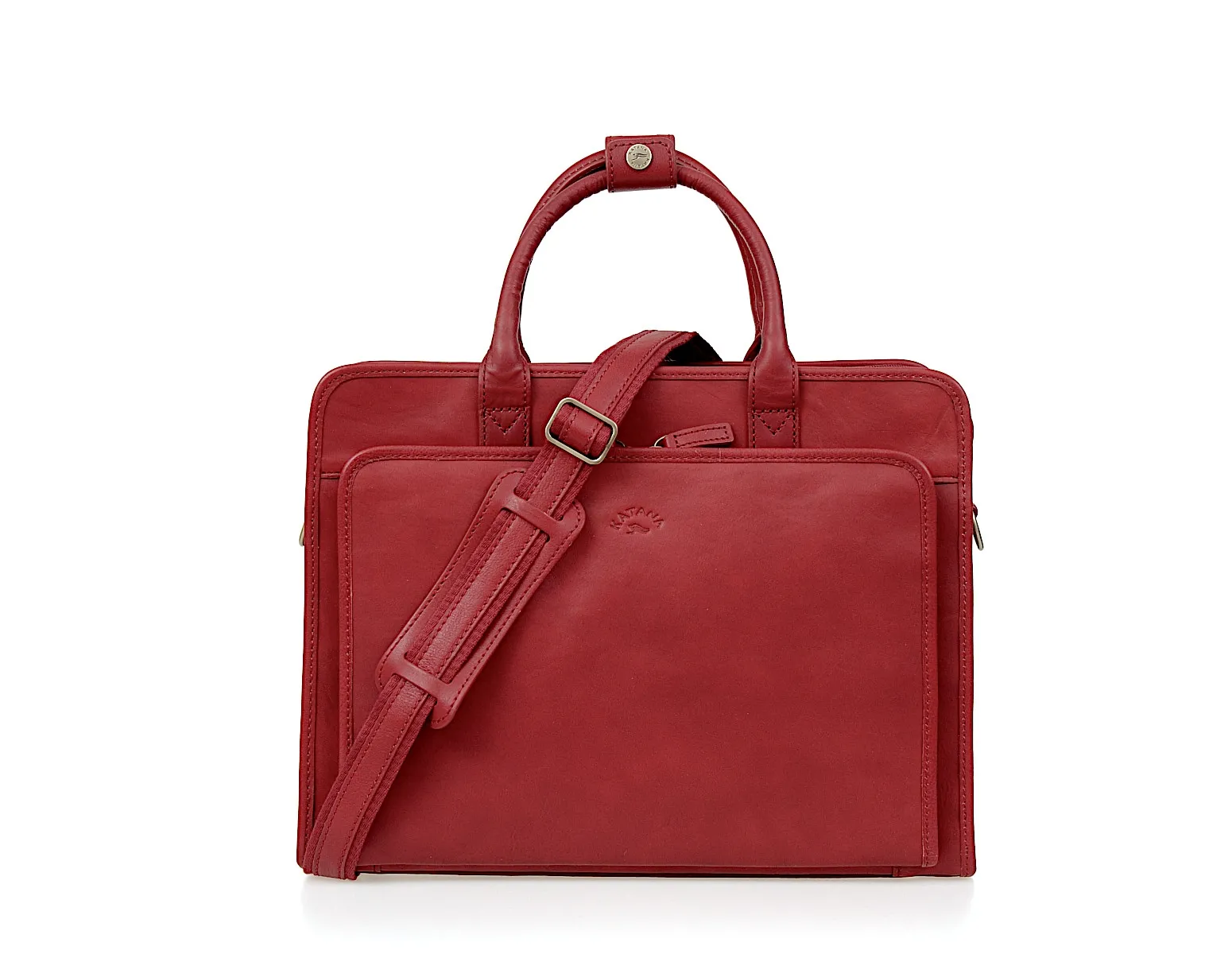 Teczka wykonana z naturalnej skóry typu bycast. Charakteryzuje się imponującą pojemnością i specyficznym ”biglowym” zamknięciem. Stwarza ono szeroki, wygodny dostęp do wnętrza. Teczka posiada 4 przegrody, z czego 1 zamykana na suwak. Wyposażona jest w specjalny wkład wpinany na rzepa, stanowi on doskonałą ochronę laptopa. Stalowa rączka obłożona skórą Stalowe okucia mocujące rączkę do grzbietu teczki Zamknięcie w postaci stalowego bigla również obłożonego skórą Specjalne 4 stopki w dnie zabezpieczające przed uszkodzeniami Wnętrze wykończone trwałą podszewką Zamek patki z blokadą na kluczyk Wymiary (wysokość bez rączki x głębokość x szerokość): 36 x do 20 x 41 cm. Maksymalne wymiary mieszczącego się laptopa: 37 x 30 cm.