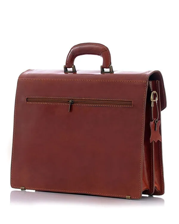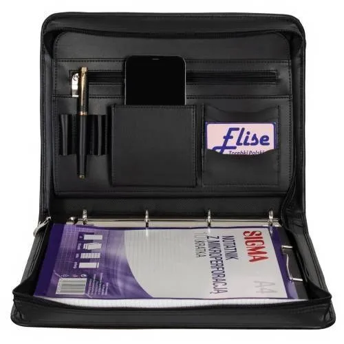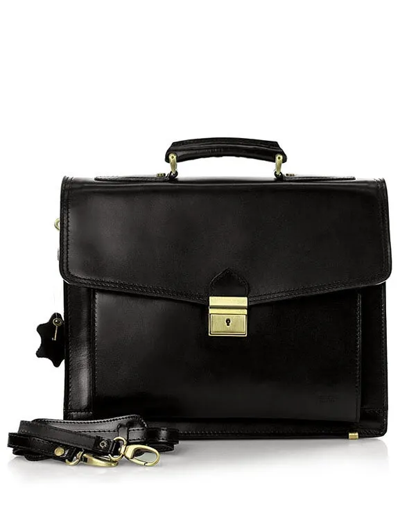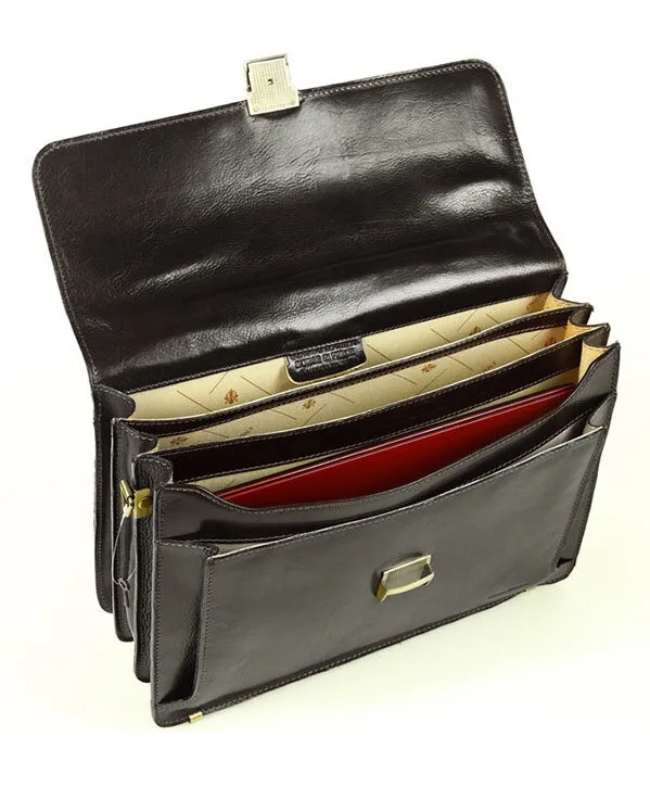 Teczka ze specjalną przegrodą do przechowywania laptopa. Wykonana z naturalnej skóry typu bycast. Zbudowana z trzech obszernych komór, z czego jedna zamykana taśmą suwakową. Właśnie ona przeznaczona jest na bezpieczne umieszczenie laptopa. Jej dno i boki wyłożone są specjalną, elastyczną wkładką mocowaną na rzepa, chroniącą zawartość przed uszkodzeniem. Bezpośrednio pod klapą znajdują się jeszcze 2 przegrody z ”mini biurem”, w którym jest: Kieszonka na telefon komórkowy Uchwyty na dwa długopisy Kieszonka na drobiazgi Kaskadowe zakładki na karty kredytowe/wizytówki Klapa zamykana zamkiem z możliwością blokowania kluczykiem. Skórzana rączka mocowana okuciami stalowymi do grzbietu teczki wzmocnionego ukrytą, stalową listwą – takie rozwiązanie to pewność trwałości nawet przy znacznych obciążeniach. Dno chronione jest czterema stalowymi stopkami. Wymiary teczki (wysokość bez rączki x głębokość x szerokość): 34 x do 20 x 41 cm.