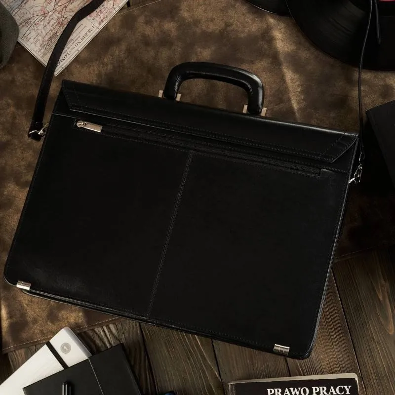 Na wnętrze teczki składają się trzy komory główne oraz wewnętrzna kieszeń na suwak. Dodatkową przestrzeń stanowią trzy frontowe kieszenie wsuwane, umieszczone pod klapą oraz tylna kieszeń na suwak po długości. Teczka zamykana zapięciem typu tic-tac posiada możliwość zakluczenia – dzięki niej masz pewność, że przechowywane w aktówce przedmioty są bezpieczne. Torbę możesz nosić w ręku lub zarzucić na ramię, korzystając z odpinanego, skórzanego paska. Aktówka z powodzeniem mieści format A4, co czyni ją odpowiednim akcesorium do pracy. Możesz przechowywać w niej dokumenty, książki czy teczki. W jednej z komór umieszczono mocowanie zabezpieczające laptopa, dzięki któremu urządzenie nie uszkodzi się podczas transportu. Wewnątrz teczki znajduje się również naszywana kieszeń na telefon, organizer na długopisy oraz kieszonka na wizytówki. Ten model będzie odpowiedni dla wszystkich biznesmenów, którzy pragną mieć pod ręką najważniejsze drobiazgi.