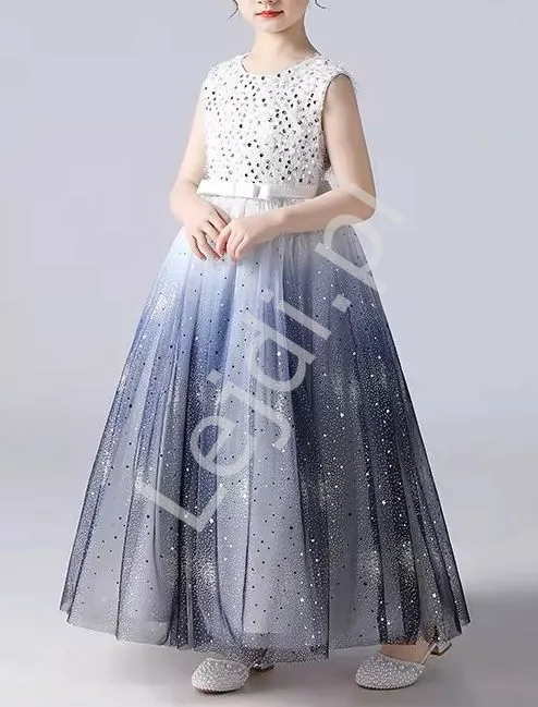 Brzoskwiniowo różówa sukienka dla dziewczynki z tiulu i koronkii. Modna różowa sukienka dziecięca na komunię, na biały tydzień czy dla małej druhny. Modna sukienka dziecięca.
