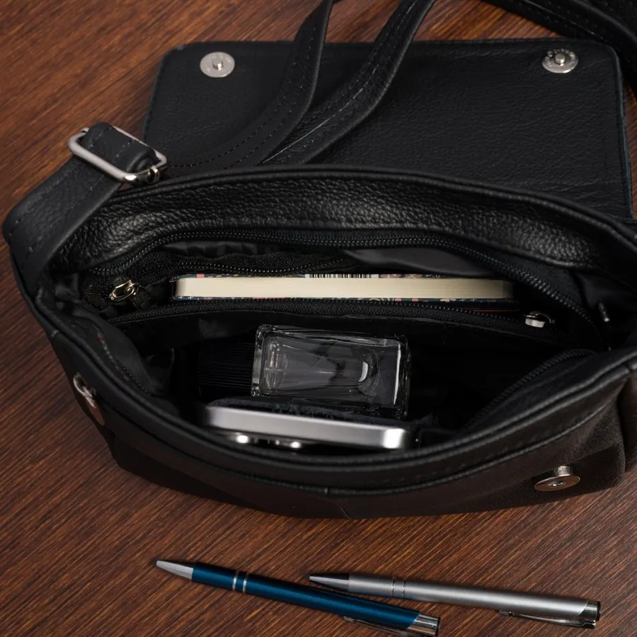 Torebka marki DAN-A, zapinana na zamek, wykonana z wysokiej jakości skóry naturalnej, polskiej produkcji. W środku mieszczą się dwie przegrody oddzielone kieszenią zapinaną na zamek, kieszeń na telefon oraz kieszeń na zamek.