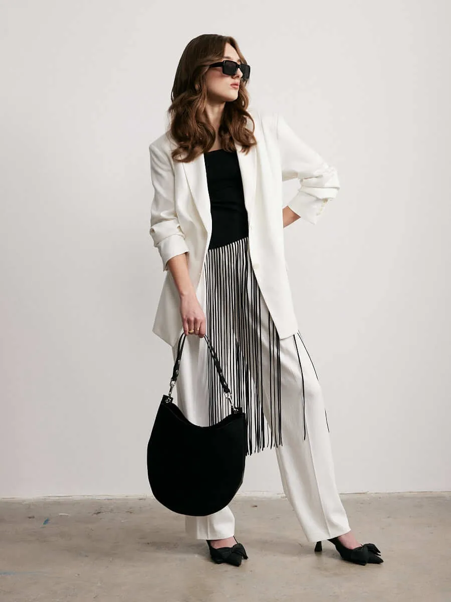 Torebka damska wykonana z zamszu i skóry naturalnej z regulowanym paskiem.