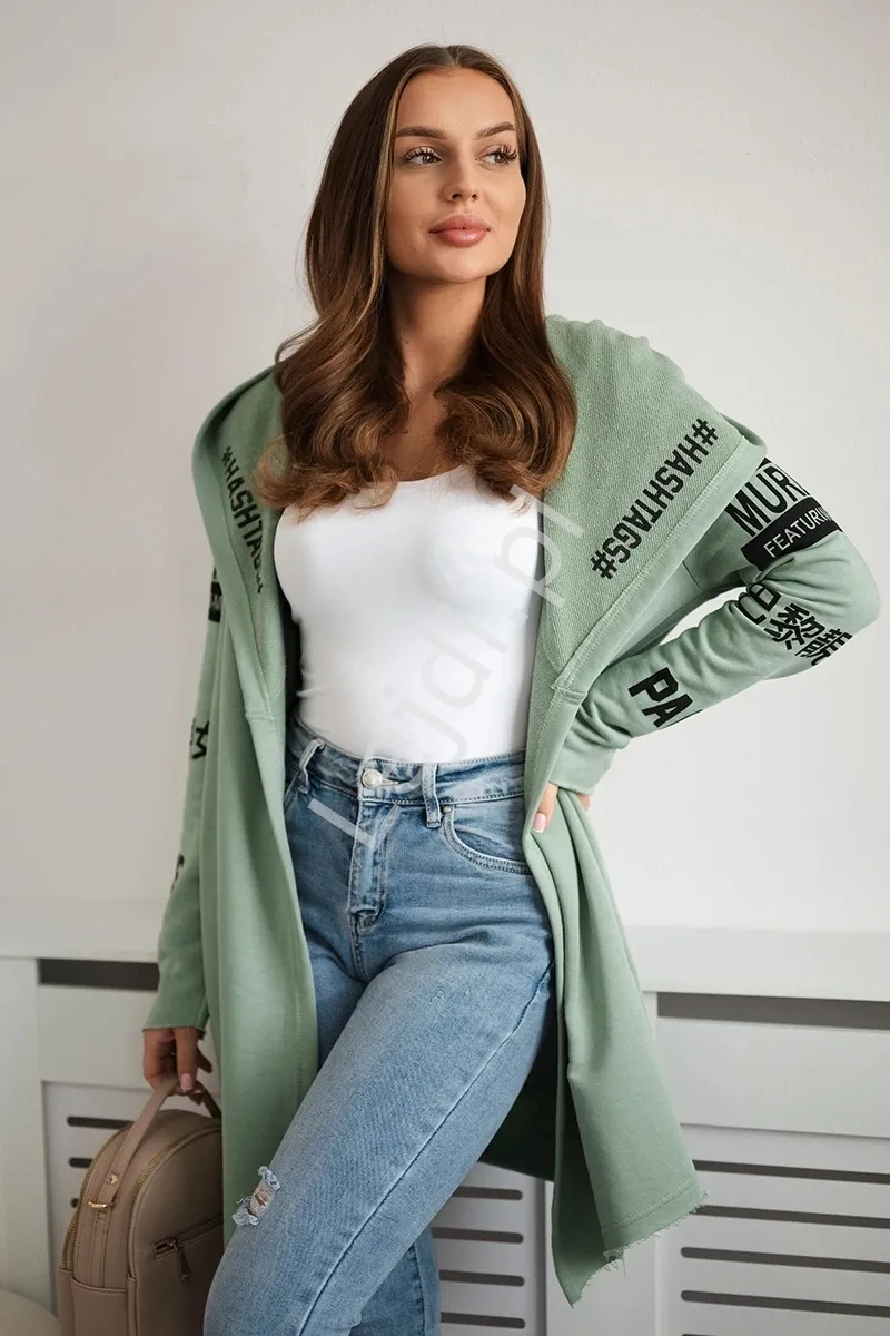 Miętowa narzutka damska, bawełniana bluza z napisami #HASHTAGS#
