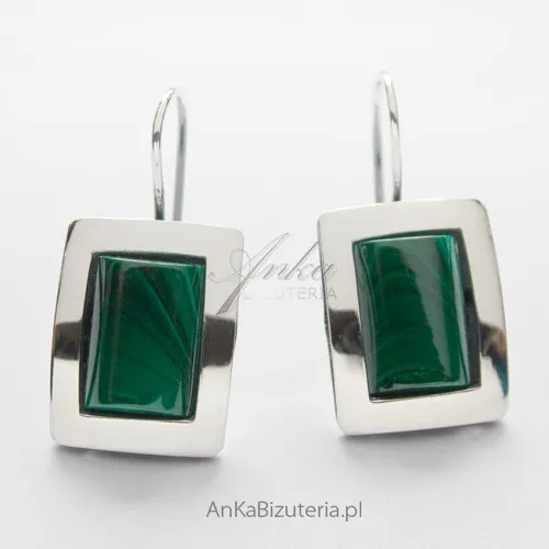 Srebrne kolczyki z malachitem - prostokąt na biglu