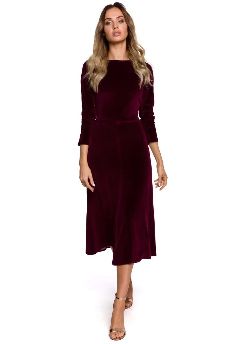 Welurowa Rozkloszowana Sukienka Midi - Bordowa - Rozmiar: S