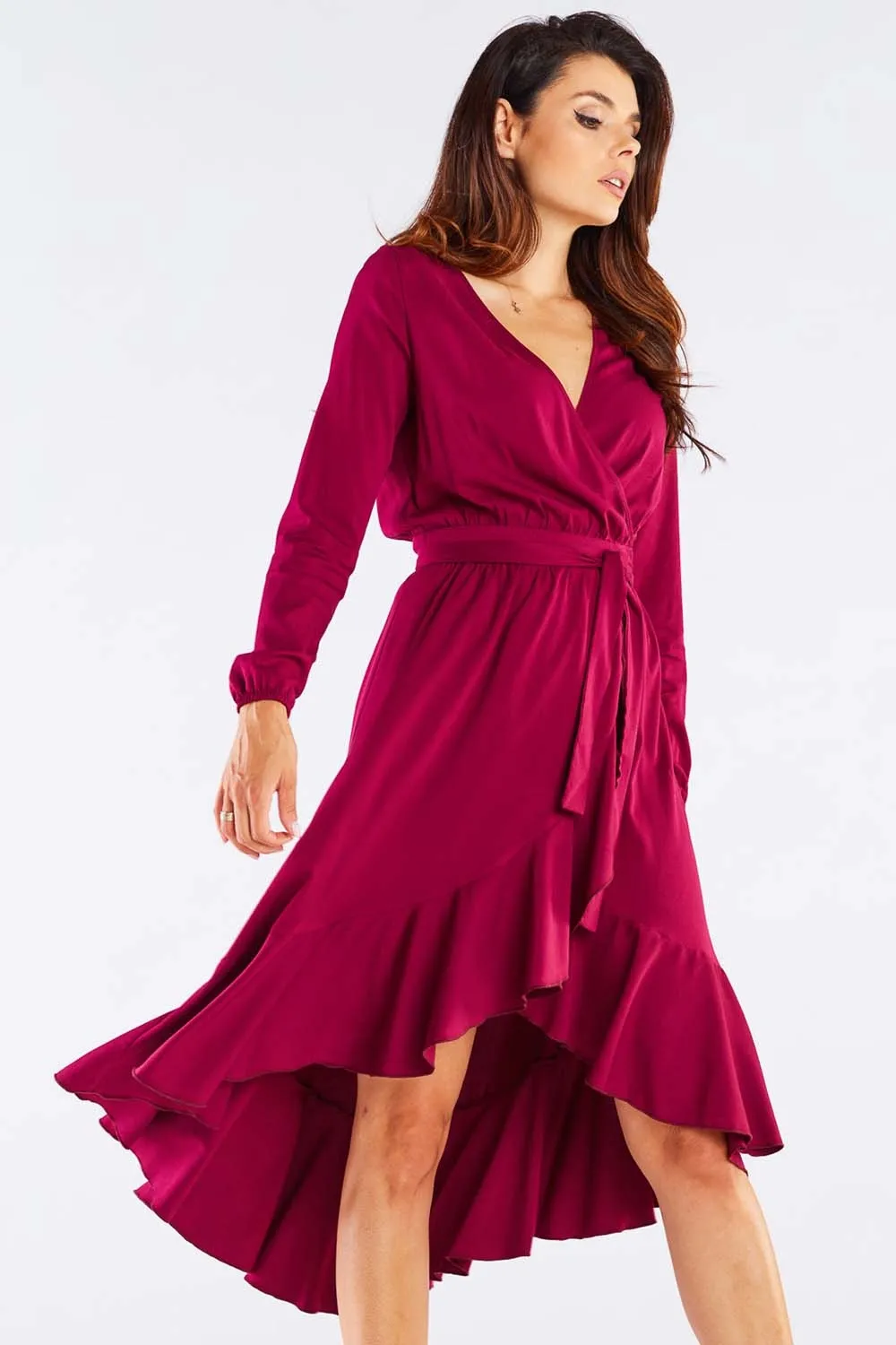 Asymetryczna Sukienka z Kopertowym Dekoltem i Falbankami - Bordowa