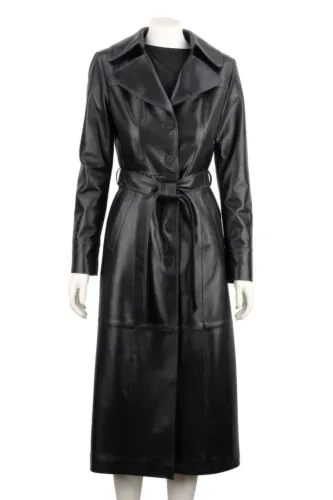 KRND450 - długi czarny płaszcz skórzany damski z paskiem DORJAN