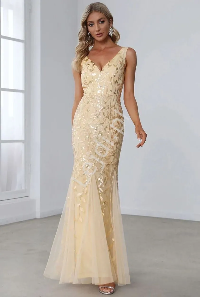 Wieczorowa sukienka z haftowanymi listkami i cekinami. Dopasowana sukienka rybka z rękawkami ala motylek. Modna sukienka na wesele, na bal, na studniówkę czy występy sceniczne. Długa sukienka tiulowa.