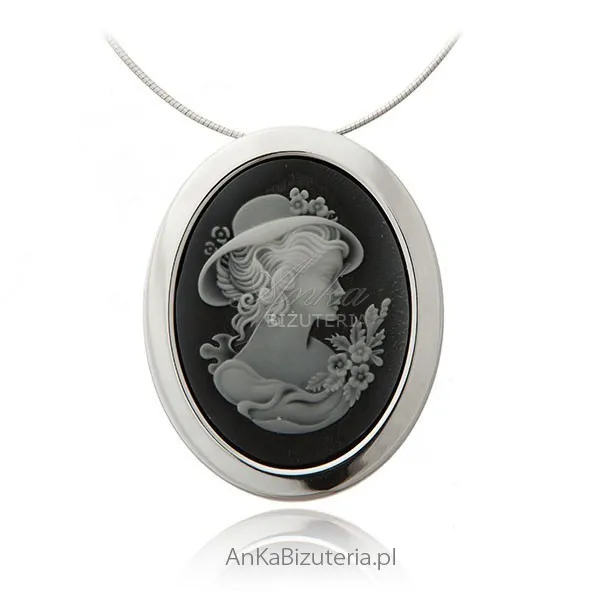 nr. prod. 77.73kap2342 Wisior srebrny z agatem i masą perłową Kamea, wisior średni Srebro próba 925 Waga wisiora:ok. 4,98 g Kamienie: agat, masa perłowa Wielkość: dł. 4 cm + 1 cm przywieszka/ szer. do 3 cm Eleganckie opakowanie do wisiorka Gratis – na zdjęciu. POLECAMY KOLCZYKI, BRANSOLETKĘ ORAZ PIERSCIONEK DO KOMPLETU!! Kamea na zdjęciu jest z łańcuszkiem z kałczuku – który posiadamy w ofercie sklepu. Biżuteria która zasłynęła w XIX wieku, stała się koniecznym elementem stroju eleganckiej kobiety. Panie chętnie przypinały Kamee, pod szyją lub w kołnierzach sukien. Obecnie towarzystwo takiej biżuterii świadczy o dobrym guście właścicielki niezależnie od wieku. Wisior można nosić w towarzystwie łańcuszka , wstążeczek, linek kałczukowych, w zależności od doboru nadamy wisiorowi pożądany charakter. Kamea jest płaskorzeźbą , rzeźbioną w muszli na agatowym grafitowym podkładzie.