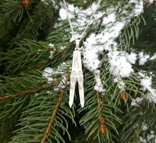Wisiorek srebrny w kształcie małych retro nart. Wykonany ze srebra, następnie zoksydowany. Kolor: szary. Długość wisiorka 3,3 cm. Waga: 2,1 gr. Zawieszka sprzedawana bez łańcuszka. Nr katalogowy :H15WC
