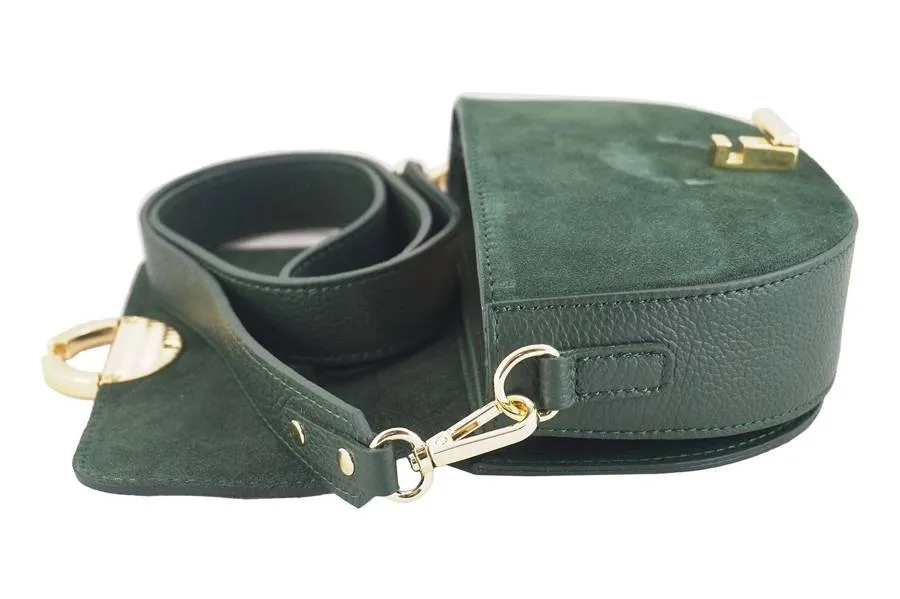 Wnętrze listonoszki: jednokomorowe wnętrze jest wykończone podszewką. Wewnątrz wyodrębniono zasuwaną kieszeń mieszczącą kosmetyki, klucze lub mały notes. Modna torebka wizytowa skórzana jest zapinana ozdobnym zapięciem, posiada złote okucia, wygony szeroki pasek bez regulacji (długość 105cm, wysokość 50cm, szerokość paska 3cm). Na zewnątrz, z tyłu, znajduje się zasuwana ozdobnie doszyta kieszeń. Łączenie skóry naturalnej licowej ze skórą naturalną zamszową wyróżnia ten model listonoszki dostępnej w kolekcji torebek skórzanych dostępnych w sklepie.