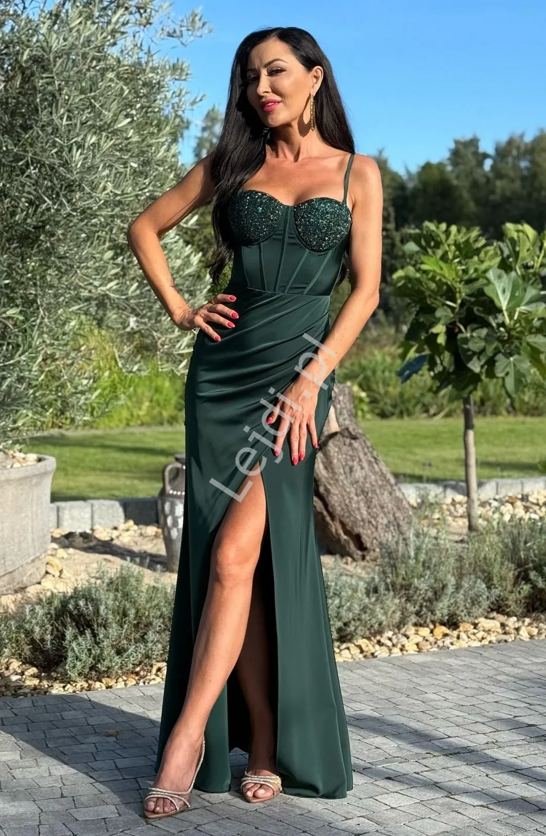 Satynowa długa suknia z ozdobnym kryształkowym biustem, butelkowo zielona