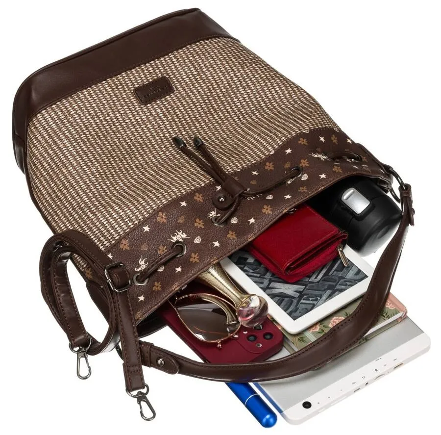 Stylowa miejska torebka damska w formie worka z wygodnym uchwytem oraz dopinanym, długim paskiem z regulacją. Front torby zdobi pleciony panel. Torebka jednokomorowa, wykończona ciemną podszewką, wyposażona w dwie praktyczne kieszonki.