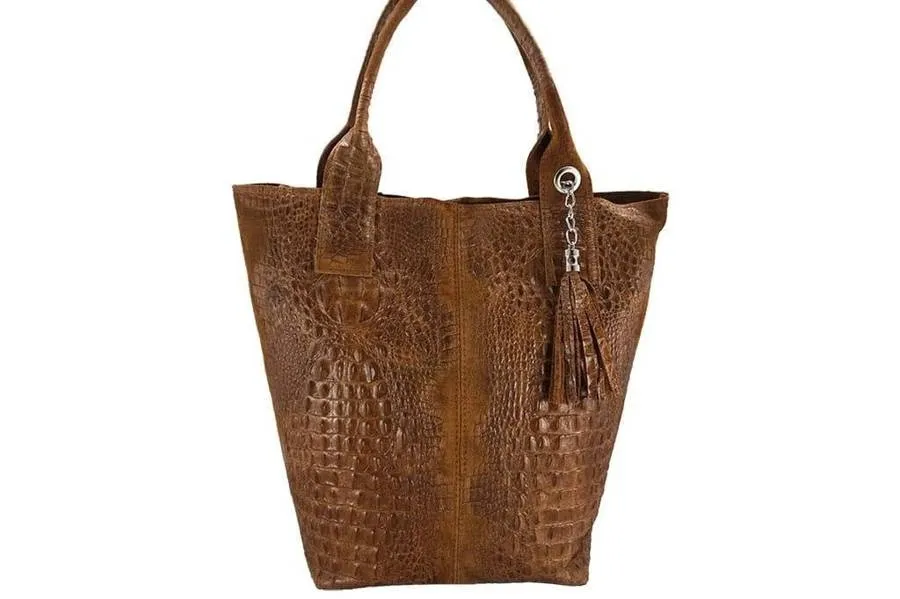 Modny worek skórzany – CROCO został wyprodukowany we Włoszech, wykonany ze skóry naturalnej zamszowej. Propozycja sklepu internetowego – torebka, która uzupełni swobodne stylizacje. Miękka zamszowa skóra naturalna, wygodnej długości uchwyty, modny frędzelek i zwierzęcy motyw – wszystko to gwarantuje, iż Twoja stylizacja będzie wyjątkowa. Modny worek skórzany typu shopper, mieszczący format A4, na wygodnej długości uchwytach idealnie komponuje się ze swobodnymi casualowymi stylizacjami do pracy oraz na uczelnię. Skorzystaj z naszej oferty i odbierz rabat -15% za zapisanie się do newslettera.