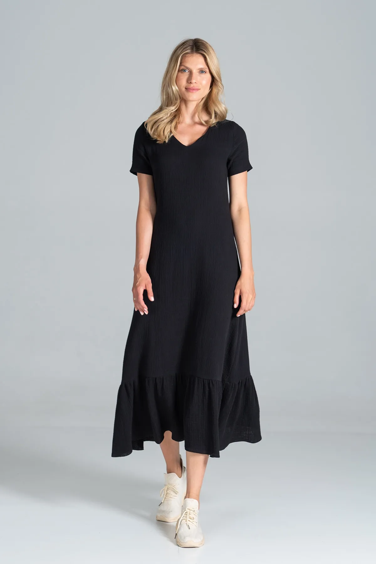 Wzorzysta Midi Sukienka w Serek z Falbanką - Czarna