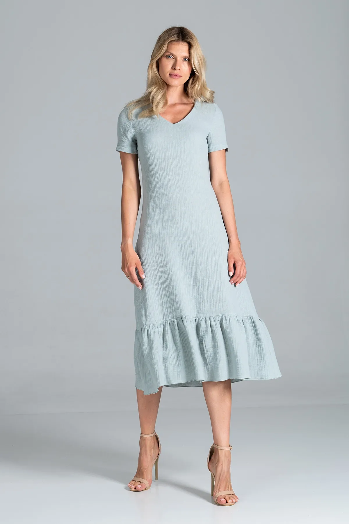 Wzorzysta Midi Sukienka w Serek z Falbanką - Miętowa