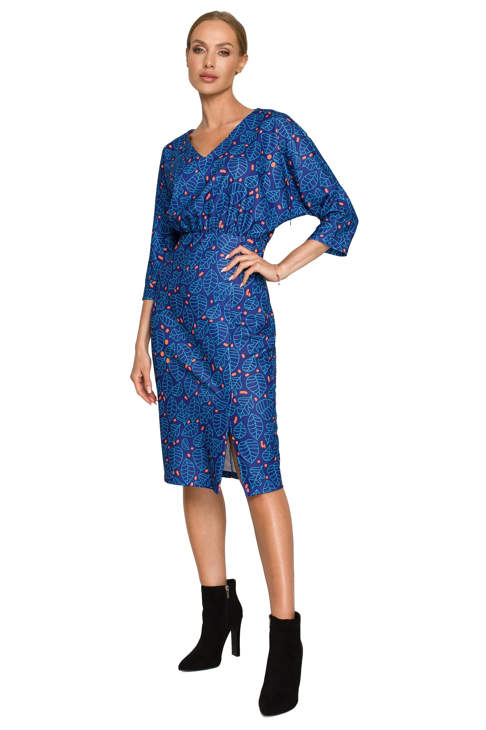 Wzorzysta wizytowa sukienka (wzór 2) to modna i bardzo stylowa podstawa garderoby, która pozwoli na skomponowanie zarówno codziennego, jak i bardziej formalnego outfitu. Kimonowe rękawy i dekolt w szpic podkreślają atuty górnych partii sylwetki i wyrównują proporcje, a ołówkowy dół o długości za kolano wysmukla nogi. Kobiecości modelowi dodają z kolei marszczenia pod biustem i rozcięcie na nodze. Sprawdzi się zarówno w wydaniu klasycznym np. z kozakami do pracy lub eleganckim ze szpilkami. Modelka ma 172 cm wzrostu i nosi rozmiar S 95% bawełna 5% elastan