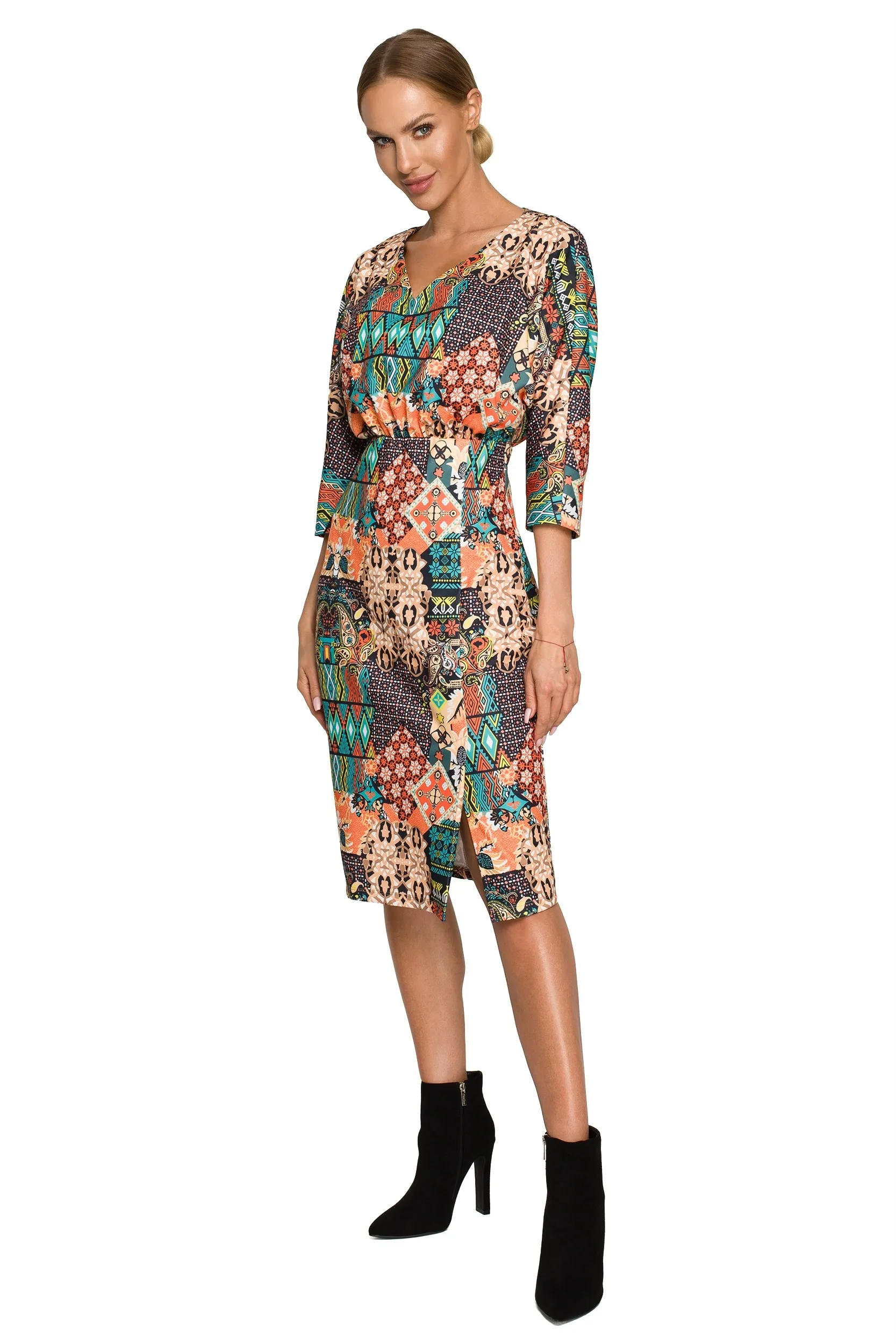 Wzorzysta wizytowa sukienka (wzór 3) to modna i bardzo stylowa podstawa garderoby, która pozwoli na skomponowanie zarówno codziennego, jak i bardziej formalnego outfitu. Kimonowe rękawy i dekolt w szpic podkreślają atuty górnych partii sylwetki i wyrównują proporcje, a ołówkowy dół o długości za kolano wysmukla nogi. Kobiecości modelowi dodają z kolei marszczenia pod biustem i rozcięcie na nodze. Sprawdzi się zarówno w wydaniu klasycznym np. z kozakami do pracy lub eleganckim ze szpilkami. Modelka ma 172 cm wzrostu i nosi rozmiar S 95% bawełna 5% elastan