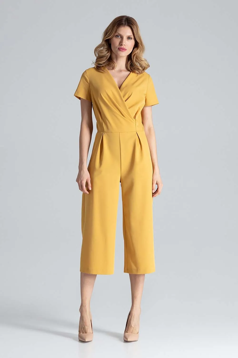 Musztardowy Kombinezon z Szerokimi Nogawkami 7/8 z Kopertowym Dekoltem