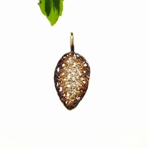 Malutki, subtelny wisiorek srebrny w kształcie listka. Wisiorek zoksydowany na piękny złoto-brązowy kolor. Długość zawieszki 3 cm, szerokość 1,5 cm. Waga: 2,2 gr.Delikatna, pełna uroku ozdoba. Wisiorek sprzedawany bez rzemienia. Nr katalogowy : L9WBR
