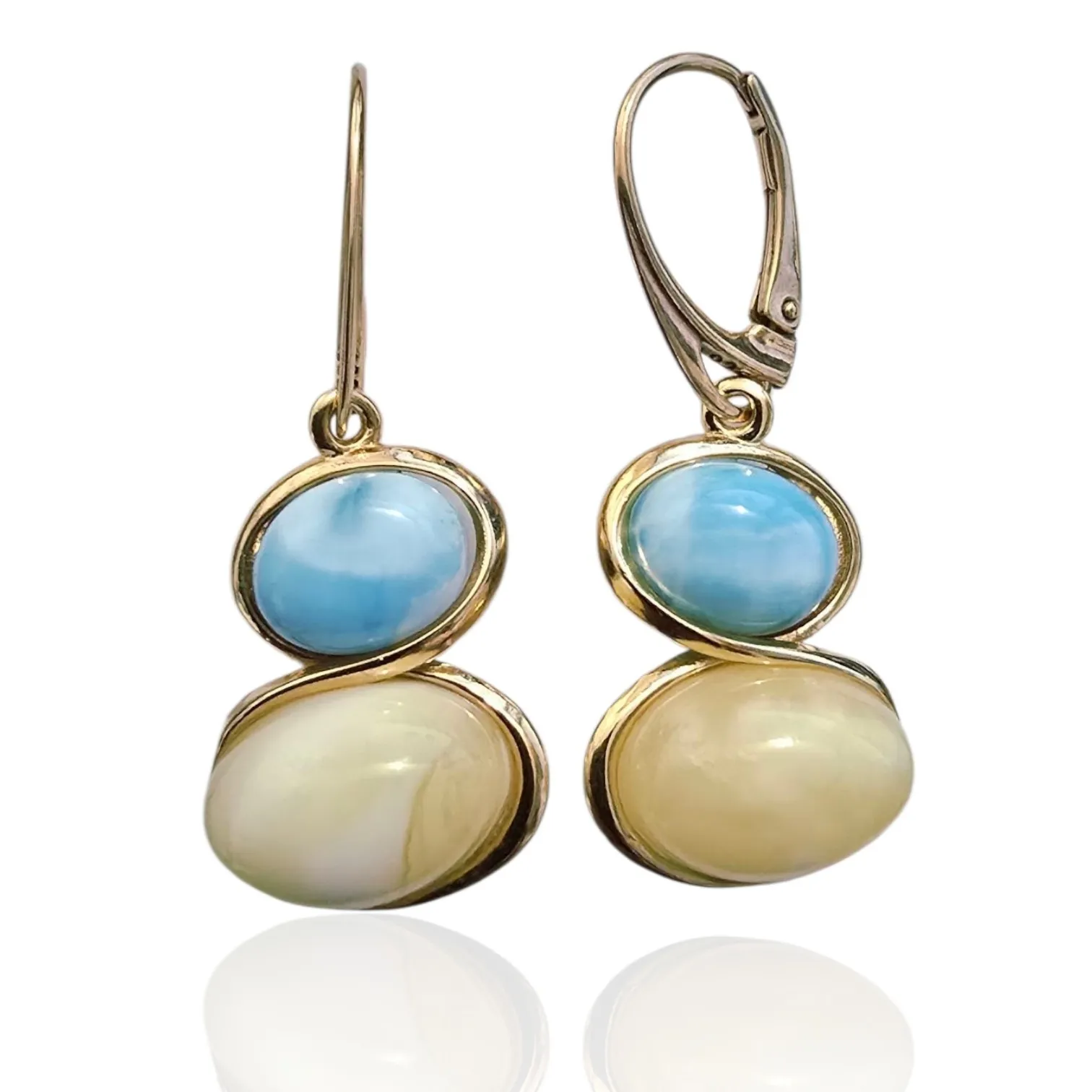 Kolczyki srebrne pozłacane z larimarem i mlecznym bursztynem "aurora larima"