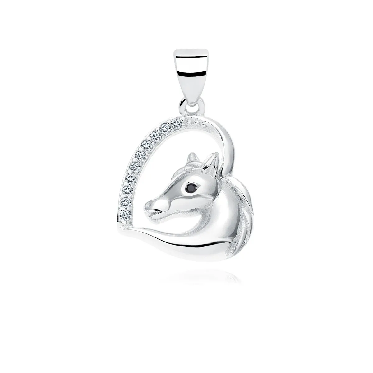Srebrna zawieszka z cyrkoniami koń w sercu z czarnym okiem i białymi cyrkoniami