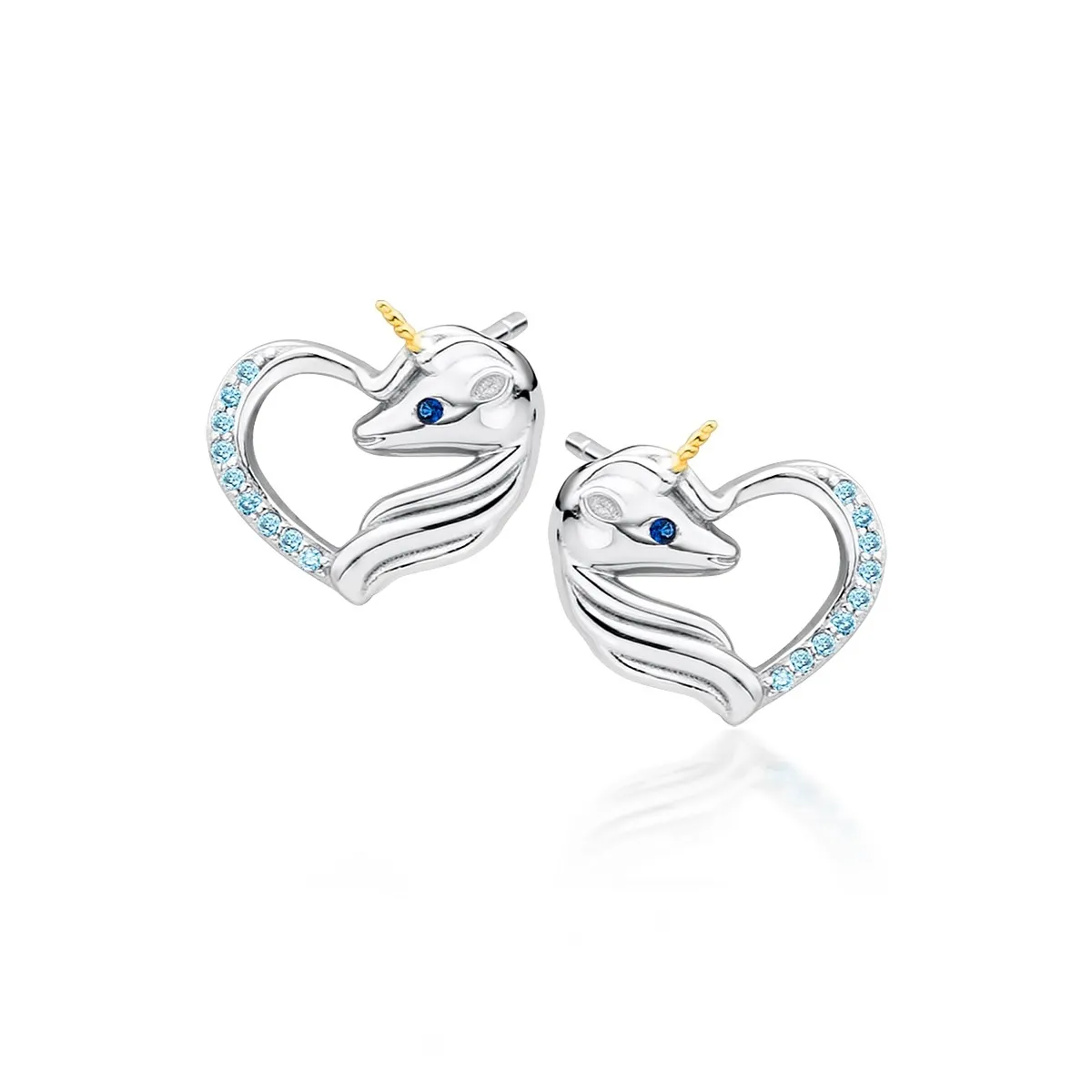 Kolczyki srebrne jednorożec w sercu z akwamarynowymi cyrkoniami i niebieskim oczkiem