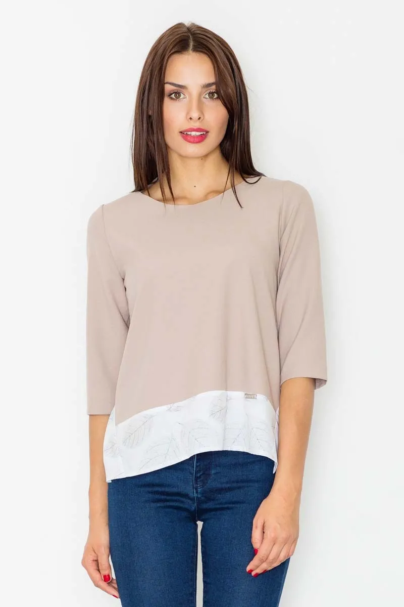 Beżowa Bluzka z Wzorzystym Dołem z Rękawem 1/2