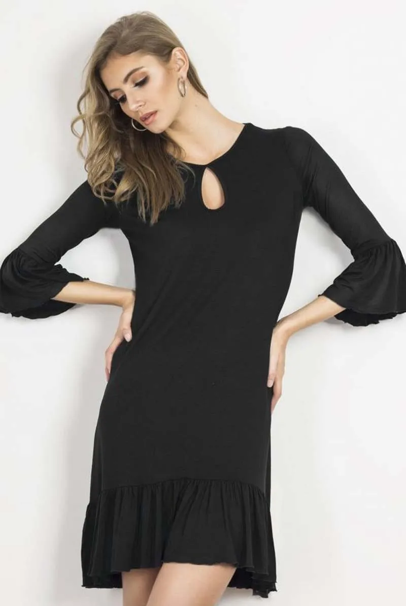 Czarna Luźna Sukienka Dzianinowa z Falbankami