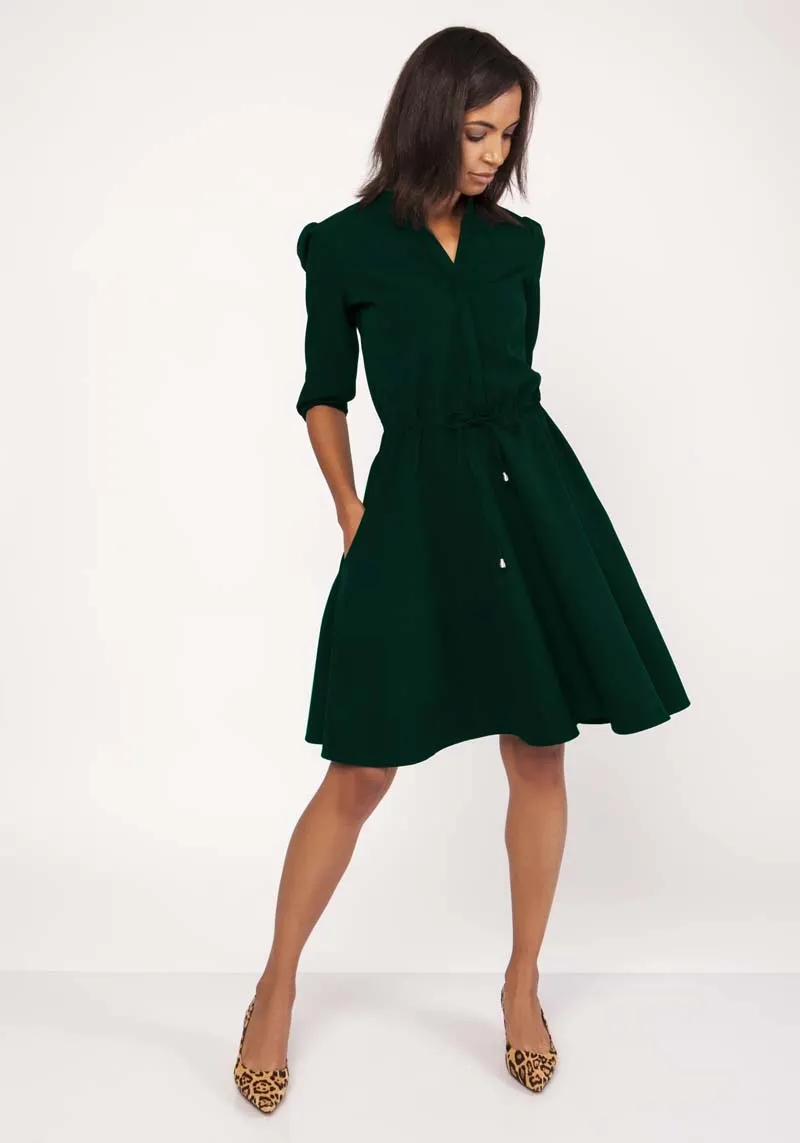 Zielona Sukienka ze Stójką z Rozkloszowanym Dołem