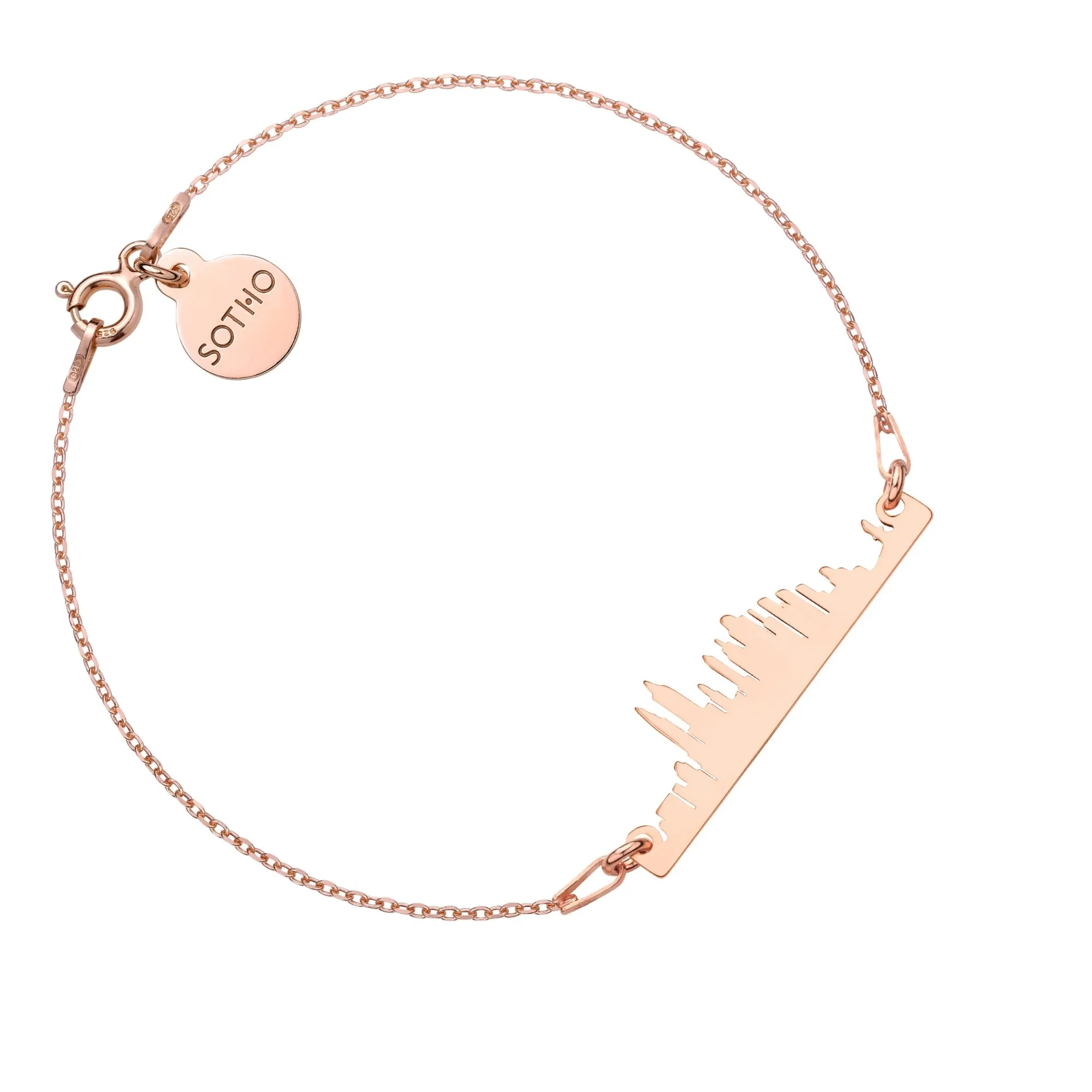 Złota bransoletka łańcuszkowa zdobiona zawieszką w kształcie miasta Nowy Jork i zawieszką z logo marki. Całość wykonana ze srebra 925 powlekanego 24 karatowym żółtym złotem. Długość ok. 18 cm. Grubość łańcuszka 1 mm. Miasto 31 x 10 mm.. Zawieszka z logo 10 mm. Produkt o wadze poniżej 5 g. Zapakowana w eleganckie pudełeczko z logo marki. Posiada logowaną metkę. Istnieje możliwość zamówienia bransoletki innej długości, z innym modelem zawieszki, z kilkoma zawieszkami, na innym modelu łańcuszka, w wersji ze srebra 925 lub srebra 925 powlekanego 24 karatowym różowym złotem itp.