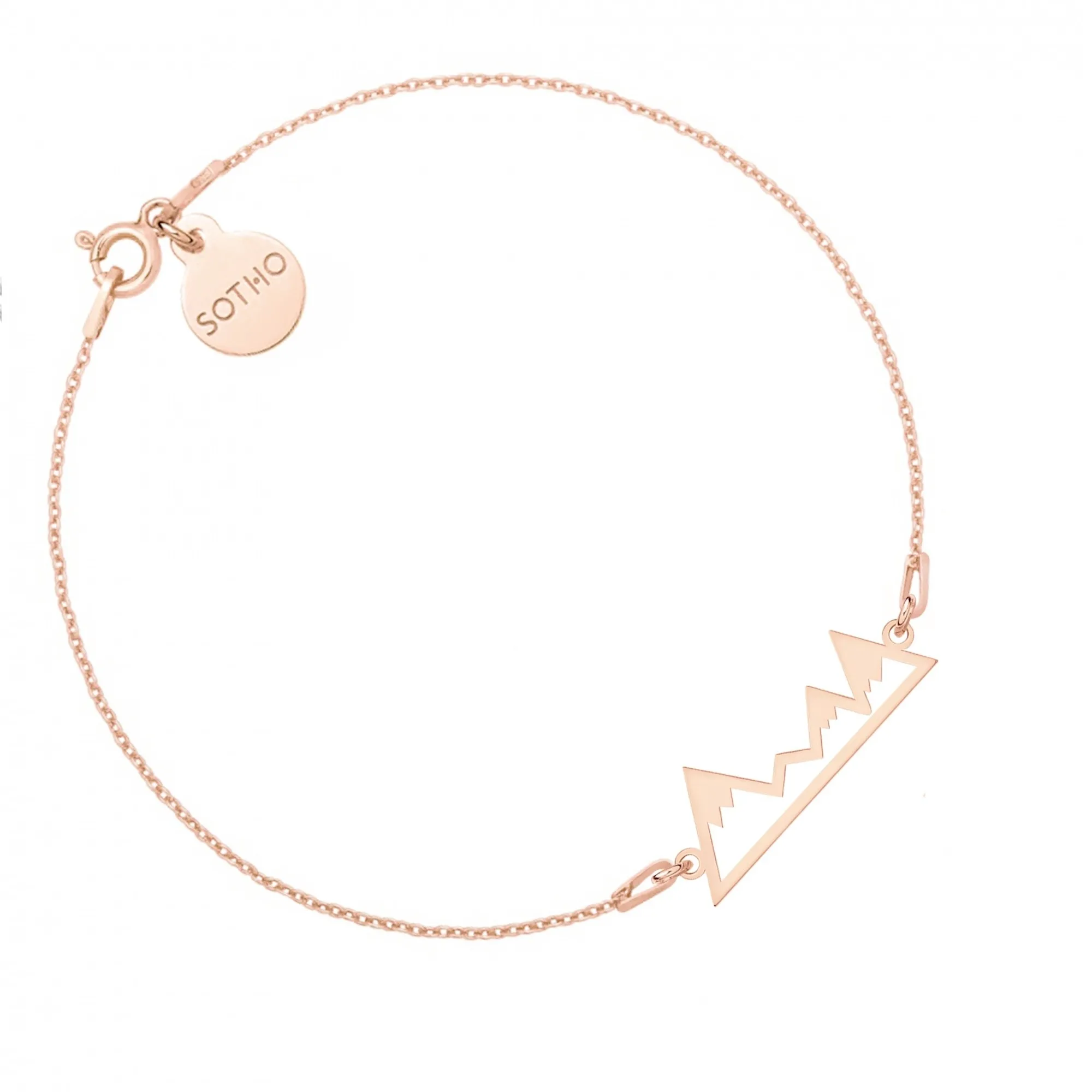Złota bransoletka łańcuszkowa zdobiona górami i zawieszką z logo marki. Całość wykonana ze srebra 925 powlekanego 24 karatowym żółtym złotem.