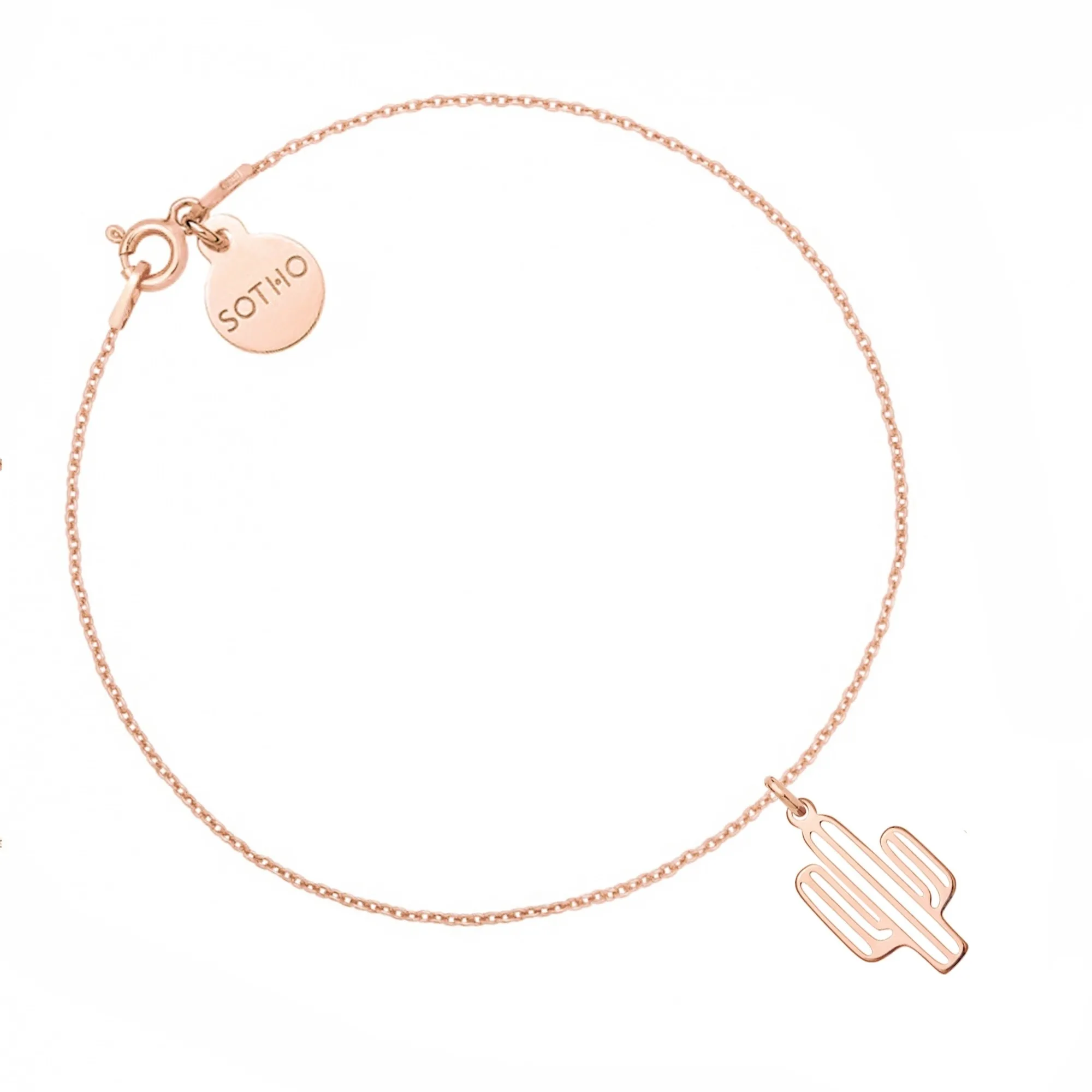 Złota bransoletka łańcuszkowa zdobiona kaktusem i zawieszką z logo marki. Całość wykonana ze srebra 925 powlekanego 24 karatowym żółtym złotem.