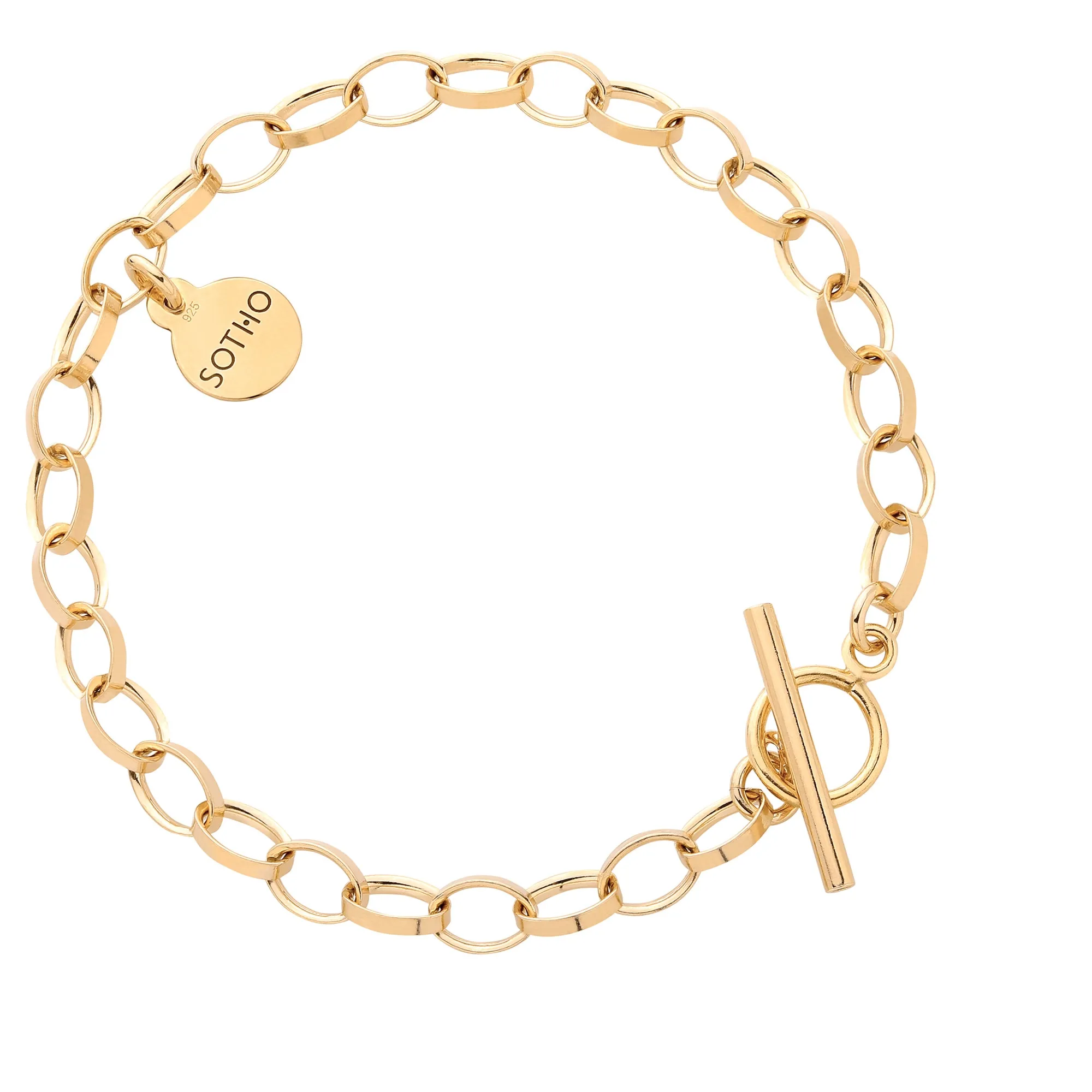 Złota łańcuszkowa bransoletka zdobiona koroną wysadzaną bezbarwnymi kryształami SWAROVSKI® CRYSTAL oraz zawieszką z logo marki. Całość wykonana ze srebra 925 powlekanego 24 karatowym złotem. Długość ok. 17 cm. Grubość łańcuszka 1 mm. Korona 11 x 16,5 mm. Zawieszka z logo 10 mm.