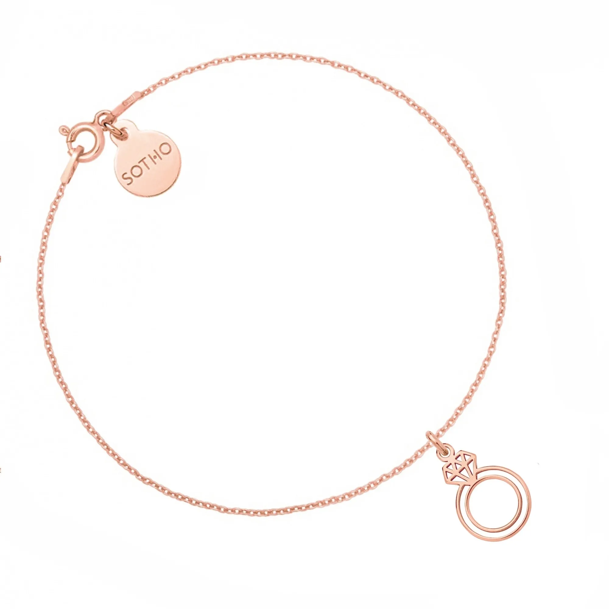 Złota bransoletka łańcuszkowa zdobiona pierścionkiem i zawieszką z logo marki. Całość wykonana ze srebra 925 powlekanego 24 karatowym żółtym złotem.