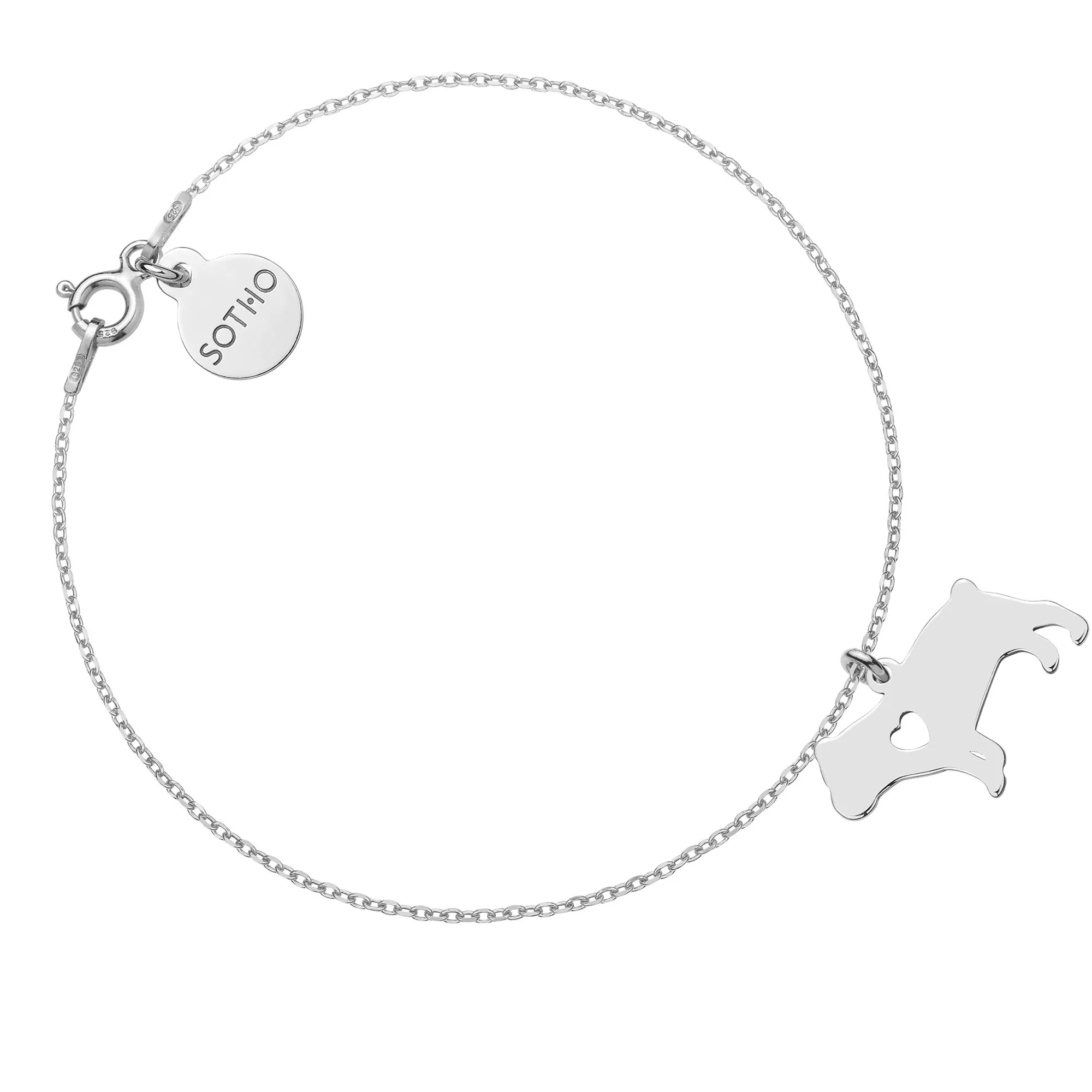 Złota bransoletka łańcuszkowa zdobiona zawieszką z psem rasy bulterier i zawieszką z logo marki. Całość wykonana ze srebra 925 powlekanego 24 karatowym żółtym złotem. Długość bransoletki 18 cm. Grubość łańcuszka 1 mm. Pies 20 x 17 mm. Zawieszka z logo 10 mm. Produkt o wadze poniżej 5 g. Zapakowany w eleganckie pudełeczko z logo marki. Posiada logowaną metkę. Istnieje możliwość zamówienia bransoletki innej długości, z innym modelem zawieszki, z kilkoma zawieszkami, na innym modelu łańcuszka, w wersji ze srebra 925 lub srebra 925 powlekanego 24 karatowym różowym złotem itp.