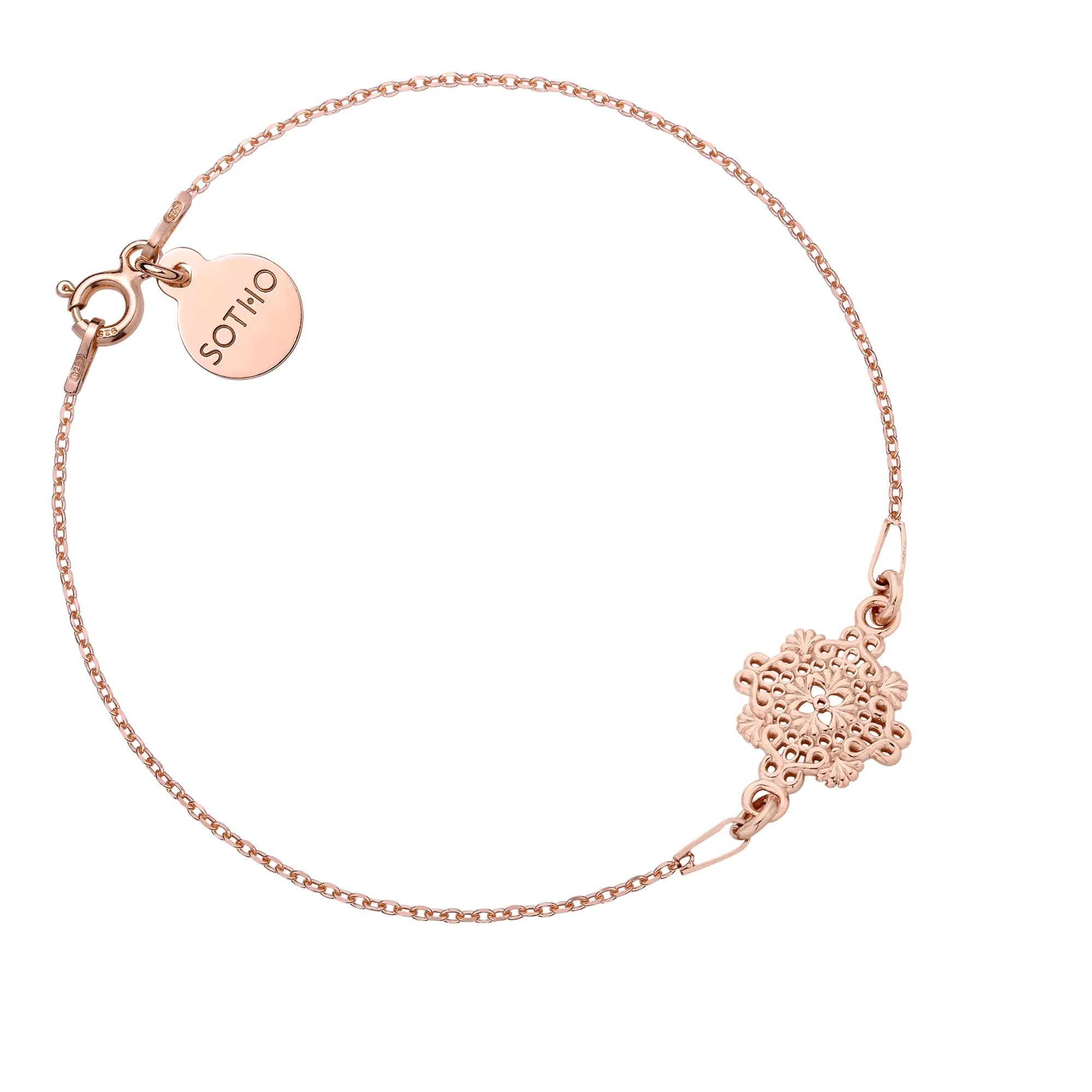 Złota bransoletka łańcuszkowa zdobiona rozetką i zawieszką z logo marki. Całość wykonana ze srebra 925 pokrytego 24 żółtym złotem. Długość ok 18 cm Grubość łańcuszka 1 mm Rozetka 17 x 10,1 mm Zawieszka z logo 10 mm Produkt o wadze poniżej 5 g. Zapakowany w eleganckie pudełeczko z logo marki. Posiada logowaną metkę. Istnieje możliwość zamówienia bransoletki innej długości, z innym modelem zawieszki, z kilkoma zawieszkami, na innym modelu łańcuszka, w wersji ze 925 lub srebra 925 powlekanego 24 karatowym różowym złotem, z dodatkowymi kamieniami, perłami lub kryształami SWAROVSKI® CRYSTAL itp.