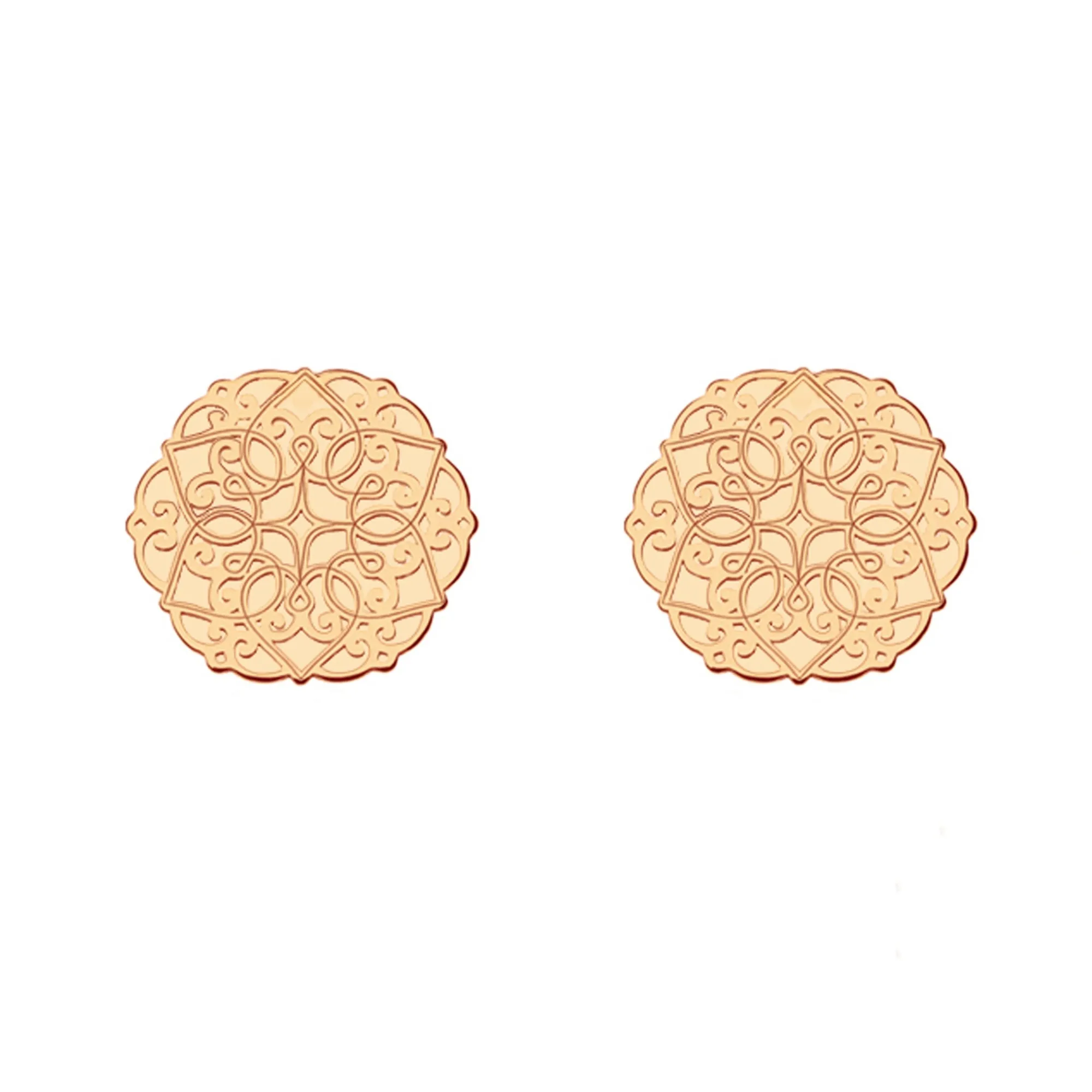 Złote kolczyki ażurowe rozetki. Zapinane na sztyft. Kolczyki posiadają zapięcia (baranki). Kolczyki w całości wykonane są ze srebra 925 powlekanego 24 karatowym żółtym złotem. Rozetka 9 mm Produkt o wadze poniżej 5 g. Kolczyki zapakowane w pudełeczko z logo marki.Posiadają logowaną metkę. Istnieje możliwość zamówienia kolczyków w innym kształcie, ze srebra 925 lub srebra 925 powlekanego 24 karatowym różowym złotem itp.